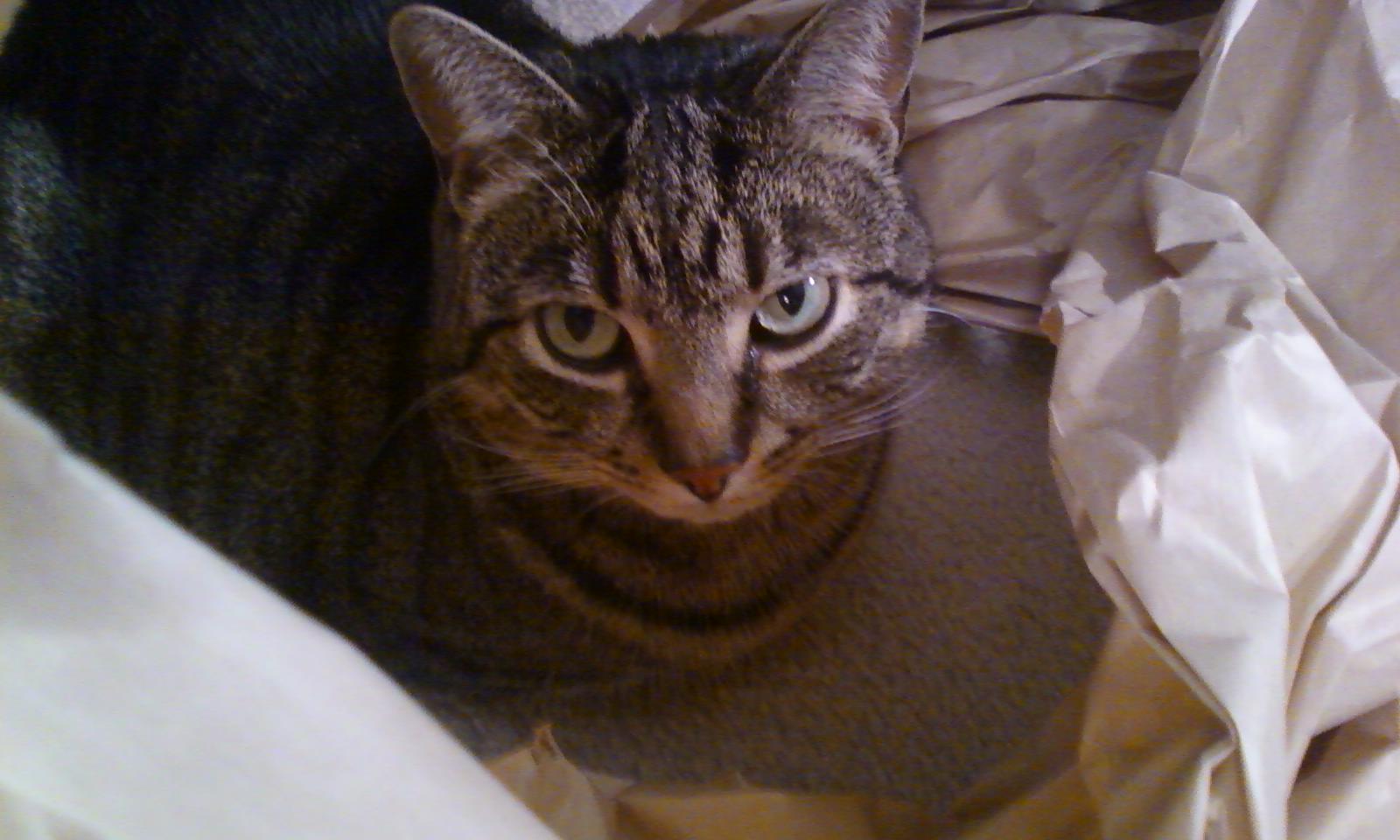 Last week Mr Chewy sent us lots of good foods. While we are eating through them, it appears the box and packing paper are here to stay. Every time the mom looks, they are occupied. Now she would feel bad cause she doesn't like to deny us any pleasure!